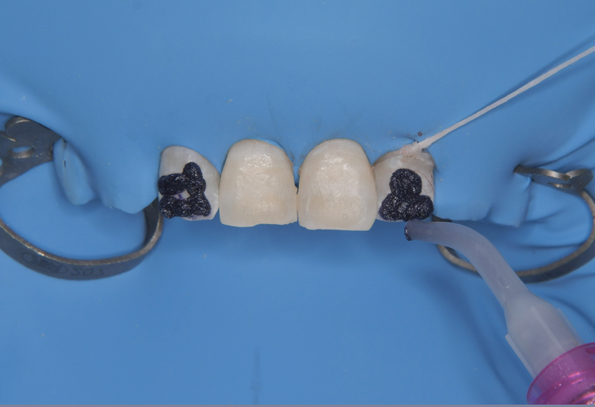 オパールーストラを用いたエナメルマイクロアブレージョンでは、炭化ケイ素の微粒子を含む薬剤を使用し、化学的作用と研磨作用を組み合わせて、変色したエナメル質を除去します。